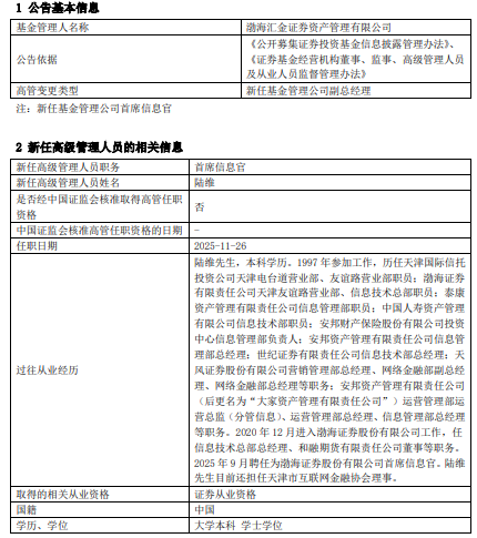 渤海汇金证券资产管理公司任命陆伟为首席信息